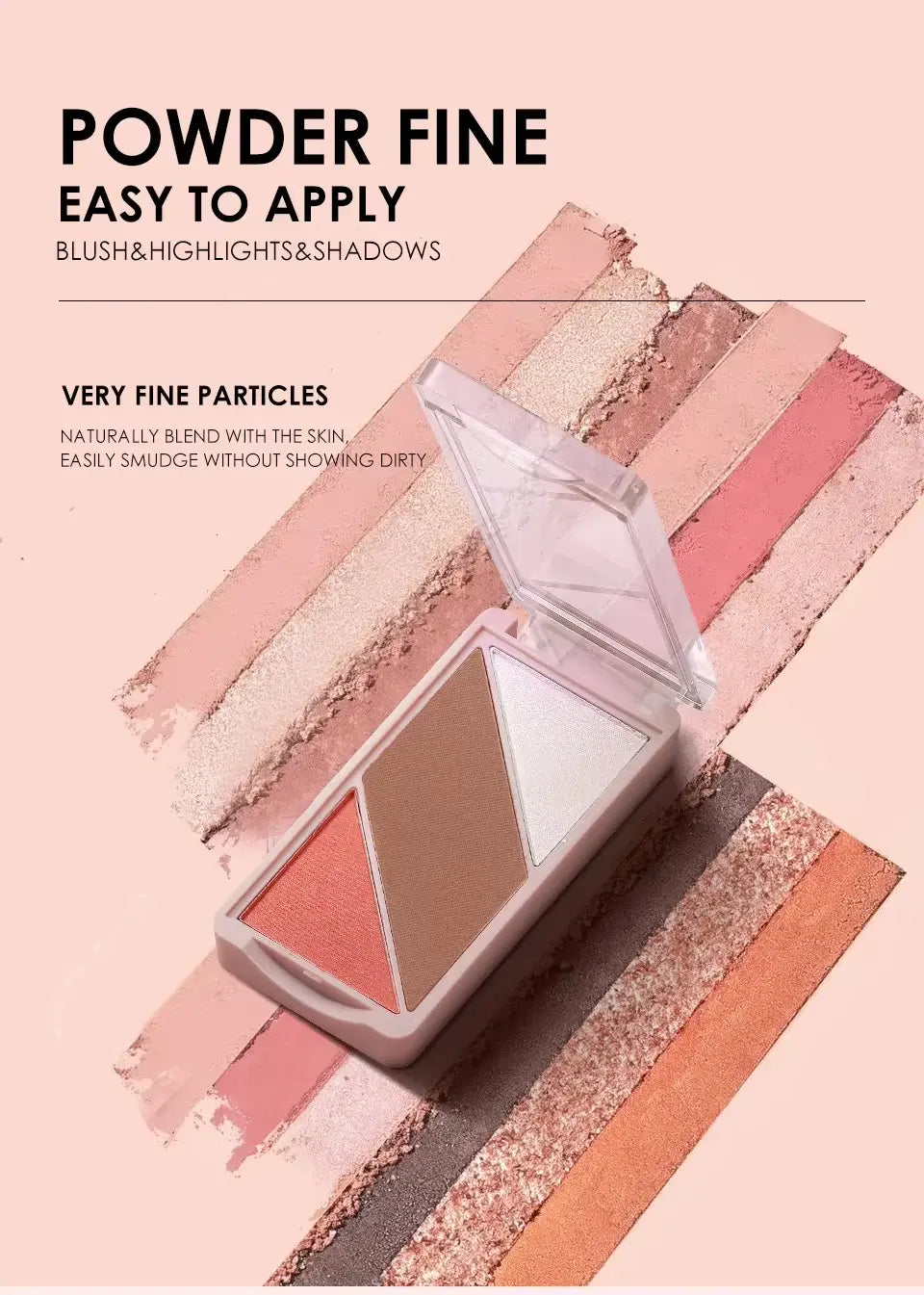 3 Color Powder Palette: Choose from #1 Blush Palette, #2 Highlighter Palette, or #3 and #4 Highlighter, Contour, and Blush 3-in-1 palettes. Compact and portable for on-the-go application.